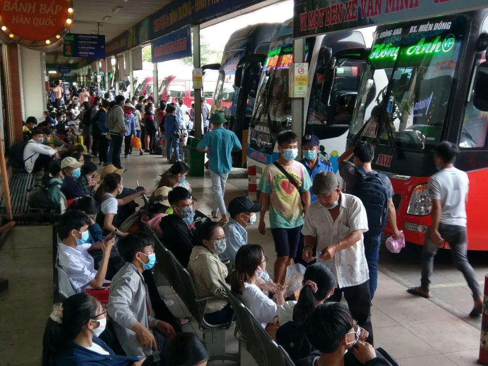 Trên tuyến Quốc lộ 13, hàng trăm xe khách tăng cường vào Bến xe Miền Đông đón khách cũng "chịu chung số phận". Bên trong bến xe, hàng ngàn hành khách sau khi mua được vé vẫn phải ngồi chờ hàng giờ để đợi xe quay đầu vào bến.