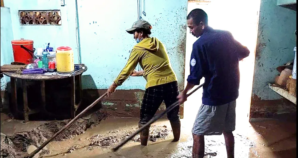 Sáng 19-11, trời nắng ráo, vết sạt trên đỉnh núi Cấm (thôn Chánh Thắng, xã Cát Thành, huyện Phù Cát, Bình Định) vẫn còn rỉ rả chảy tràn đất đá đỏ ngầu. Sau nhiều ngày sơ tán, hàng chục người dân thôn Chánh Thắng ở sát vách núi sạt lở trở về nhà dọn dẹp núi bùn sạt lở để khắc phục nhà cửa, tài sản, thóc lúa, gà vịt…