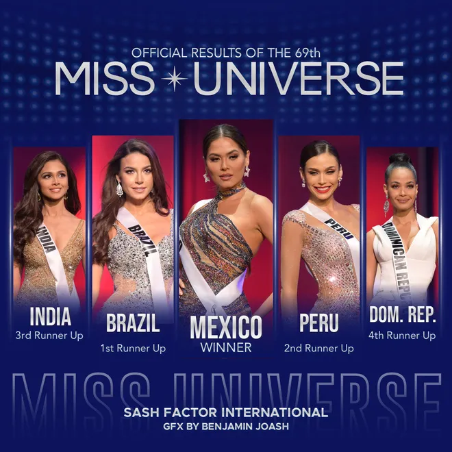 Người đẹp Mexico Andrea Meza đã xuất sắc đăng quang ngôi vị Hoa hậu Hoàn vũ 2020, sau khi gây ấn tượng mạnh với Ban giảm khảo trong phần thi ứng xử và thuyết trình. Tân Hoa hậu Hoàn vũ là người đẹp Andrea Meza có chiều cao 1,8m, số đo ba vòng 89-66-89 cm. Cô từng đoạt danh hiệu Á hậu 1 Miss World 2017.