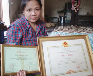 Không có chồng, mọi công việc trong xưởng, trong nhà chị đều một tay cáng đáng. Từ việc lo bữa cơm hằng ngày cho các con đến việc ngoại giao bên ngoài. Chị thường xuyên nhận hàng khảm trai, đánh giấy giáp… thuê cho các xưởng mộc trong làng nghề. Đã hơn 10 năm nay, người trong làng nghề đã biết rất rõ về chị, một người đàn bà rất giữ chữ tín và có trách nhiệm với công việc. Không vì thế mà tất cả các mặt hàng gỗ có gắn khảm trai ở làng nghề đều có sự góp sức của mẹ con chị.