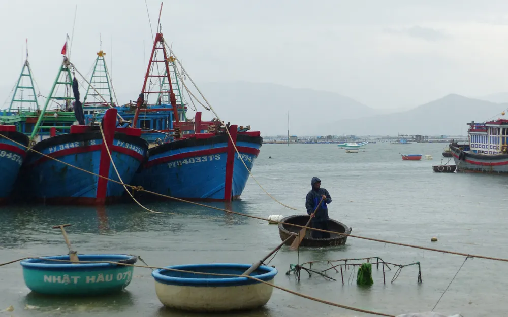 Ngư dân khẩn trương cột tàu, neo đậu vào bờ tại thị xã Sông Cầu. Ảnh: ÁNH DƯƠNG