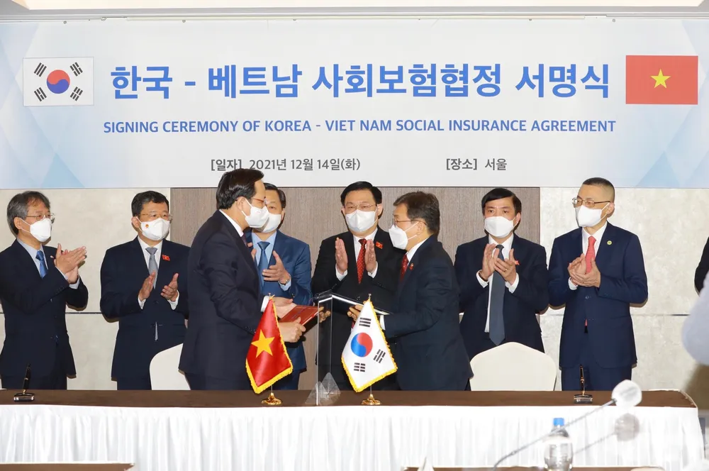 Sáng nay, 14-12, Việt Nam và Hàn Quốc đã ký hiệp định song phương về bảo hiểm xã hội. Sau hiệp định này, người lao động Việt Nam đi làm việc tại Hàn Quốc sẽ chỉ cần đóng bảo hiểm xã hội một lần và có lương hưu khi đến tuổi.