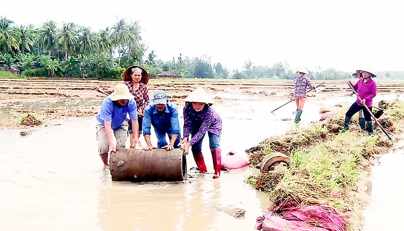 Nông dân huyện Hoài Nhơn (Bình Định) ra đồng trực nước dọn lũ   để khôi phục sản xuất