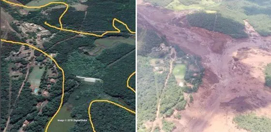 Hình ảnh trước và sau vụ vỡ đập tại mỏ quặng sắt Corrego do Feijao. Ảnh: Twiter