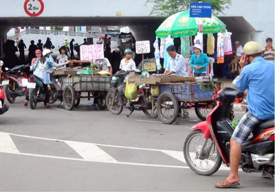 Hàng trăm mét chiều dài vỉa hè và lòng đường trước cổng Khu chế xuất Linh Trung và hầm chui Linh Trung (phường Linh Trung, quận Thủ Đức, TPHCM) đã bị những người buôn bán hàng rong chiếm dụng làm nơi họp chợ, gây nhếch nhác, mất mỹ quan đô thị và cản trở giao thông.