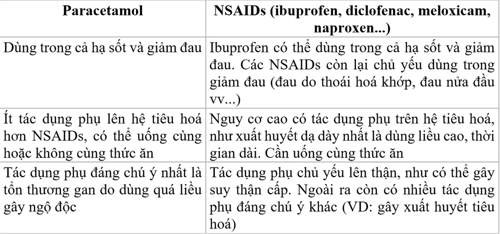 3 điểm khác biệt lớn nhất giữa paracetamol và NSAIDs bao gồm: