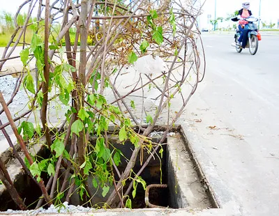 Bạn đọc Dương Danh Xuân (ở quận 2, TPHCM) gọi điện đến Báo SGGP phản ánh: Hố ga tại đầu cầu Cá Trê Lớn trên đại lộ Đông Tây (phường An Khánh, quận 2, TPHCM) vừa bị các xe ben chở bê tông tươi cho một công trình xây dựng gần đó cán nát nắp, lộ ra miệng hố rộng, rất nguy hiểm cho các phương tiện giao thông trên đường (ảnh).