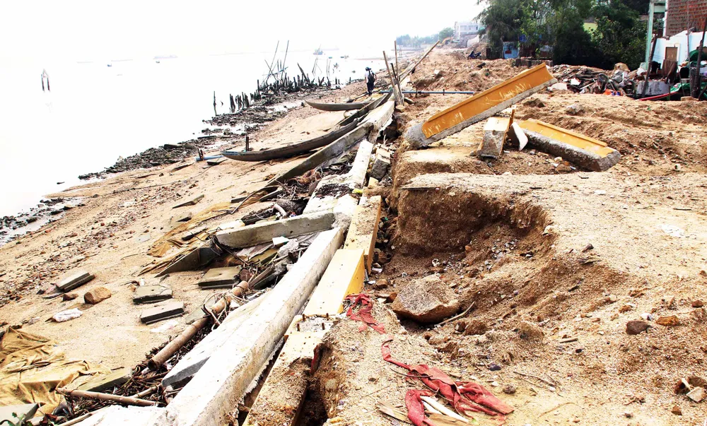 Cụ thể, mực nước biển dâng cao lớn hơn mực nước thiết kết, trùng với thời điểm xuất hiện triều cường, kết hợp với gió mạnh trong bão trên mặt thoáng rộng của đầm Thị Nại đã tạo ra sóng lớn tác động trực tiếp vào tuyến kè; sóng lớn tràn qua đỉnh kè phá hoại mặt đường gây sạt lở mái kè…