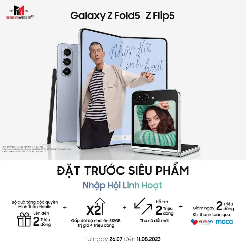 Cụ thể, khi tham gia đặt trước Galaxy Z Fold5 và Galaxy Z Flip5, người dùng sẽ nhận được những ưu đãi như: Miễn phí nâng cấp bộ nhớ trị giá 4 triệu đồng (giảm thêm 4 triệu đồng khi nâng cấp lên bản 1TB), Thu cũ lên đời trợ giá 2 triệu đồng, Bộ quà tặng độc quyền Minh Tuấn Mobile trị giá 2 triệu đồng, Giảm thêm 2 triệu đồng khi thanh toán qua VNPAY, Moca, Miễn phí 1 năm gói bảo hành mở rộng Samsung Care+ trị giá 2 triệu đồng,...