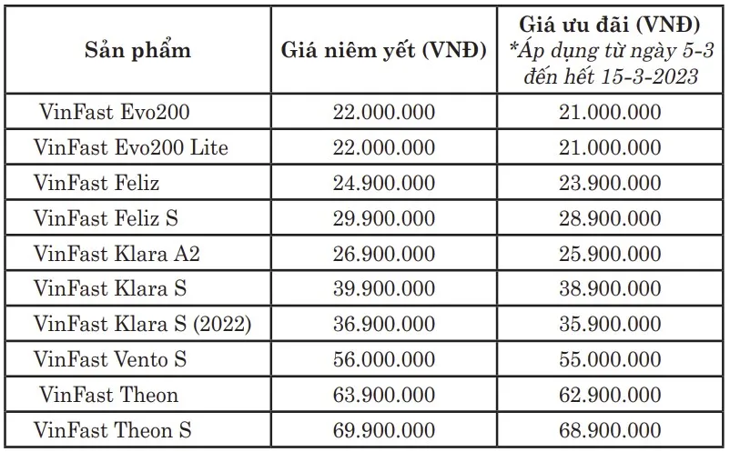 Ưu đãi và giá bán cụ thể cho các dòng xe máy điện VinFast trong chương trình “Cùng VinFast lan tỏa yêu thương” như sau: