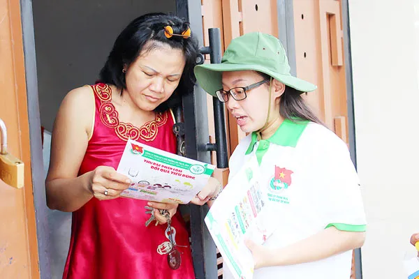 Tình nguyện viên tư vấn cho người dân về những lợi ích của việc phân loại rác tại nguồn