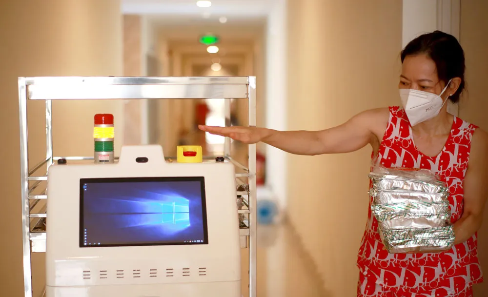 2 tuần nay, người bệnh đang điều trị Covid-19 tại BV Dã chiến thu dung và điều trị Covid-19 số 7 (phường An Khánh, TP Thủ Đức) cảm thấy thích thú khi 3 bữa cơm hàng ngày đều được một chú robot mang đến tận phòng. “Mời phòng số 3 ra nhận cơm” - mỗi khi nghe tiếng loa phát ra từ robot, chị Hoàng Ái My, đang điều trị tại BV, lại ra cửa lấy suất ăn cho mình.