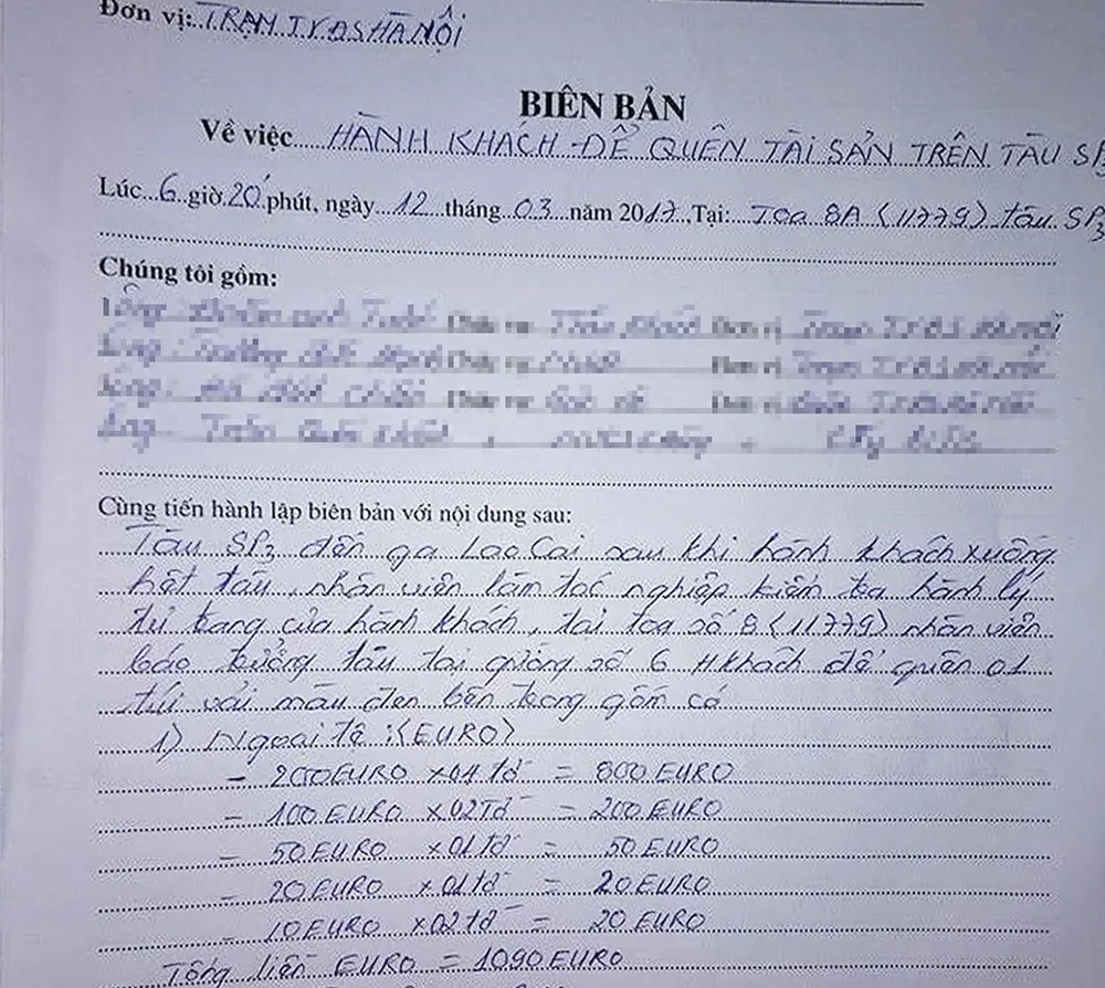 Anh Trương Đức Hạnh đã báo trưởng tàu SP3 Đoàn Anh Tuấn (Đoàn tiếp viên đường sắt Hà Nội) để tiến hành kiểm tra, lập biên bản theo quy định. Sau khi kiểm tra, bên trong túi vải có hơn 1.000 Euro, 1.400 Et Hundrede Kroner (tiền Đan Mạch) với tổng trị giá trên 30 triệu đồng cùng nhiều giấy tờ tùy thân khác mang tên hành khách C.R. Trưởng tàu đã lập biên bản bàn giao cho Trung tâm Kinh doanh vận tải đường sắt Lào Cai để trao trả cho hành khách.