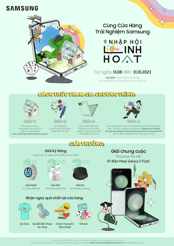 Nhân dịp này, Samsung cũng công bố trò chơi cờ tỷ phú với tổng giải thưởng lên đến hơn 77.000.000 đồng lấy cảm hứng từ tinh hoa bản sắc và tinh thần sáng tạo của Galaxy Z Flip5 và Z Fold5 mới. Thể lệ cuộc thi : Truy cập website: www.cuahangtrainghiemsamsung.com và đăng ký tạo tài khoản trước khi chơi; Người chơi Lắc xí ngầu và thực hiện các nhiệm vụ tương ứng ở mỗi ô.. và ghi lại khoảnh khắc đầy ấn tượng của bạn và chia sẻ lên Facebook cá nhân cùng Hashtag: #NhapHoiLinhHoat #CuaHangTraiNghiemSamsung #GalaxyZFlip5 #GalaxyZFold5 #JoinTheFlipSide để tích lũy điểm số .
