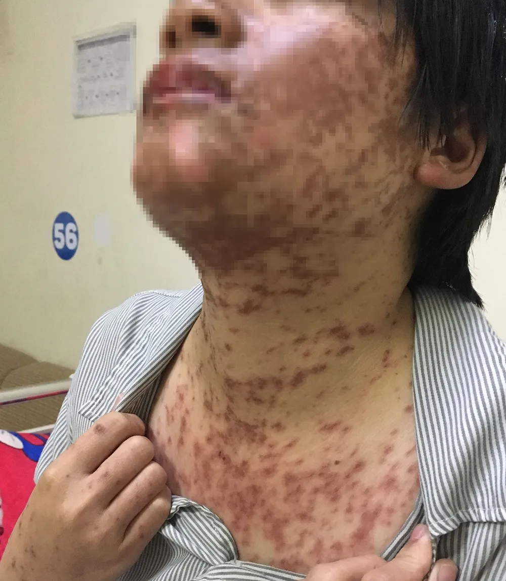 Sáng 8-2, Bệnh viện Hoàn Mỹ ITO Đồng Nai thông tin vừa cấp cứu cho bệnh nhân Trần Thị Hoàng H. (27 tuổi) nhập viện vào trong tình trạng xuất hiện dày đặc vết mẩn đỏ, mưng mủ, lan rộng khắp cả người và mặt.