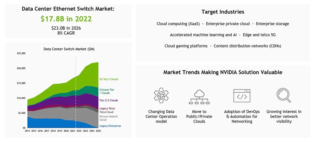 Báo cáo một số thị trường trọng điểm của mảng Data Center Networking cho thấy, doanh số của mảng này lên đến 17,8 tỷ USD trong năm 2022. Với tốc độ tăng trưởng hàng năm là 8%, dự báo đến năm 2026 thì con số này là 23 tỷ USD. Qua đó cho thấy tiềm năng của mảng này là rất lớn.