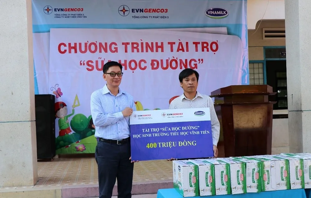 Sữa học đường là chương trình thực hiện theo sự vận động của Đảng ủy Khối cơ sở Bộ Công Thương tại TPHCM kêu gọi các đơn vị trong khối triển khai thực hiện. Trong đó, EVNGENCO3 tổ chức chương trình trao tặng sữa tại 2 địa phương có đơn vị thuộc Công ty Nhiệt điện Vĩnh Tân (huyện Tuy Phong, tỉnh Bình Thuận), Phú Mỹ (thị xã Phú Mỹ, tỉnh Bà Rịa – Vũng Tàu). Tổng giá trị mà Chương trình Sữa học đường tài trợ cho 2 địa phương là gần 1 tỷ đồng.