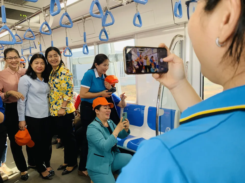 Ngồi trên tàu chạy thử tuyến metro số 1, nhiều cán bộ trong đoàn rất hào hứng, phấn khởi. Nhiều cán bộ lấy điện thoại chụp, quay lại những khoảnh khắc lần đầu tiên được đi tàu đô thị và ngắm nhìn thành phố qua tàu điện từ trên cao.