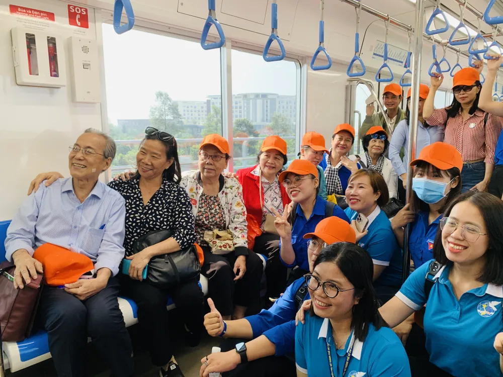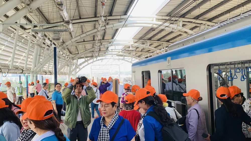 Các thành viên trong đoàn hào hứng khi lần đầu được đi trên tuyến metro số 1 |