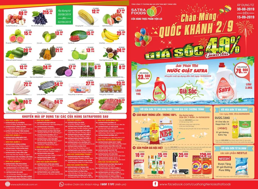 - Từ ngày 30-8 đến ngày 2-9, với mỗi hóa đơn mua hàng 1.000.000 đồng trong khu vực siêu thị tự chọn Satramart, khách hàng sẽ được giảm ngay 50.000 đồng khi mua các sản phẩm bia thùng 12 lon hoặc 24 lon. Các thương hiệu áp dụng là Heineken, Tiger Crystal, Larue, Desperados, Amstel, 333, Saigon Special, Sapporo, Zorok, Budweiser, Beck, bia tổ yến,…Mỗi khách hàng được mua tối đa 3 sản phẩm/hóa đơn/ngày.