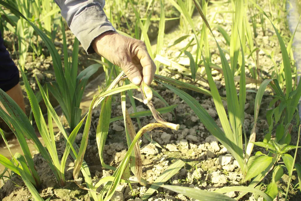 Ông Bùi Phú Vinh, thôn Hổ Tiếu, trồng 3 sào hoa lay ơn đỏ và vàng. Thế nhưng hiện tại cả 3 sào của ông Vinh đều bị hư hại nặng, lá vàng, bẹ lá tím, thối gốc rễ và phải nhổ bỏ.