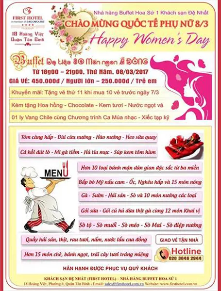 Nhà hàng Buffet Hoa Sứ 1 Khách sạn Đệ Nhất (thành viên Saigontourist) chào mừng ngày Quốc tế phụ nữ 8/3/2018 bằng chương trình "Buffet Dạ tiệc 80 món ngon Á Đông" từ 18h -21h với giá vé 450.000 VNĐ/người lớn và 250.000 VNĐ/ trẻ em