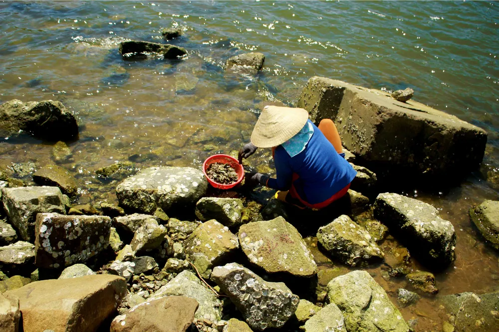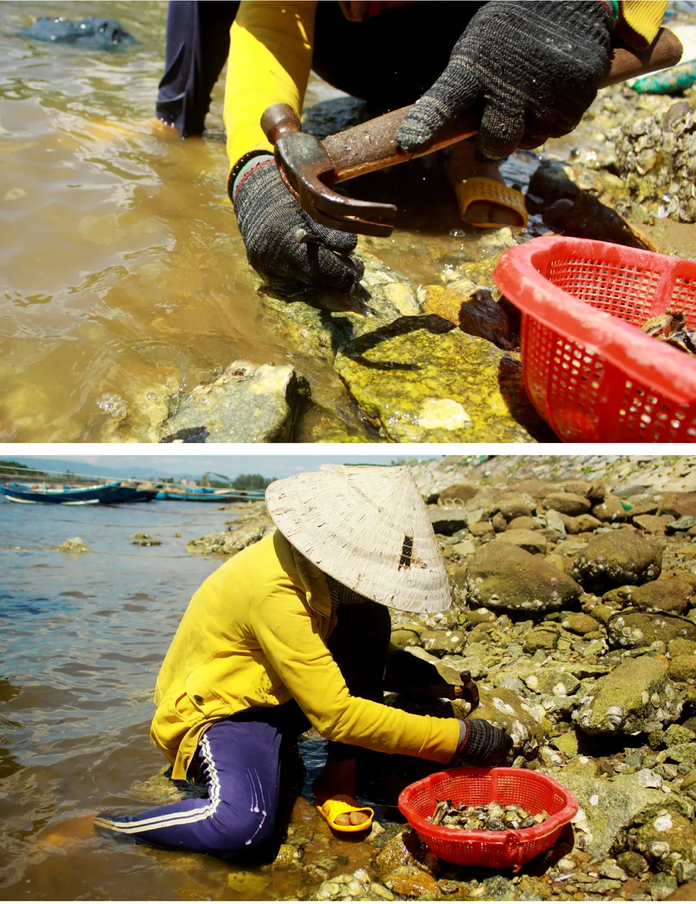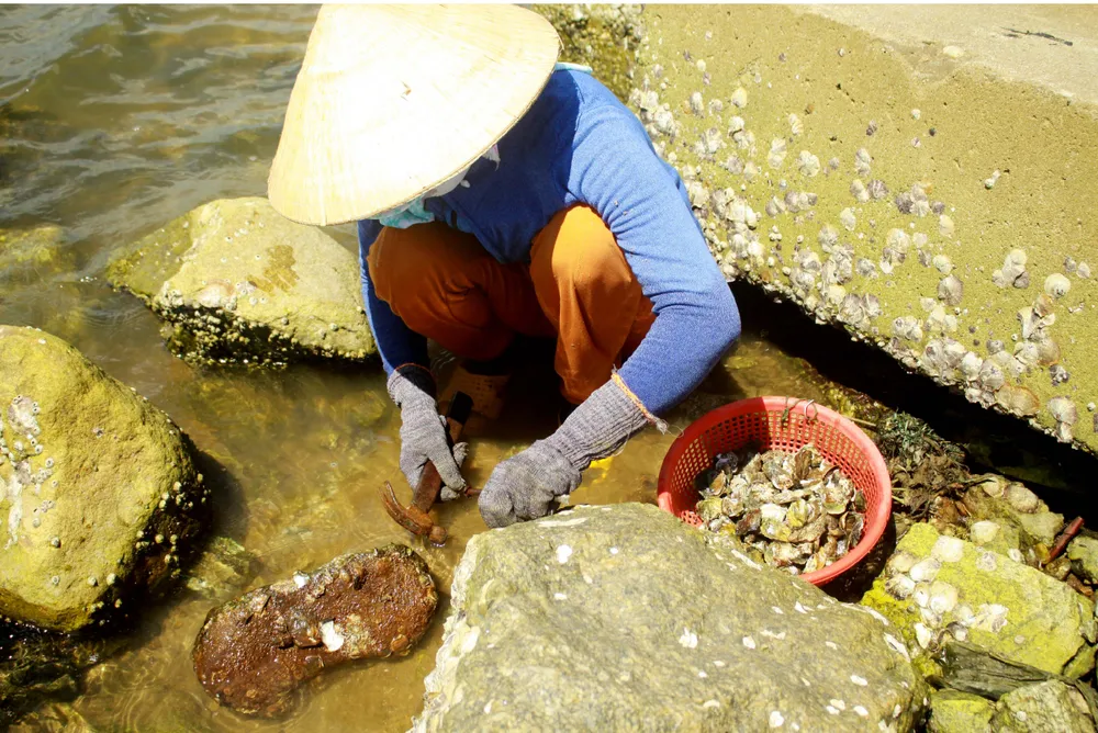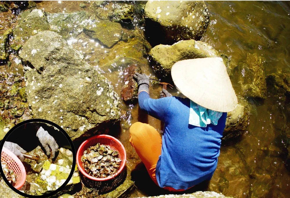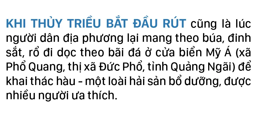 Khi thủy triều bắt đầu rút cũng là lúc người dân địa phương lại mang theo búa, đinh sắt, rổ đi dọc theo bãi đá ở cửa biển Mỹ Á (xã Phổ Quang, thị xã Đức Phổ, tỉnh Quảng Ngãi) để khai thác hàu - một loài hải sản bổ dưỡng, được nhiều người ưa thích.