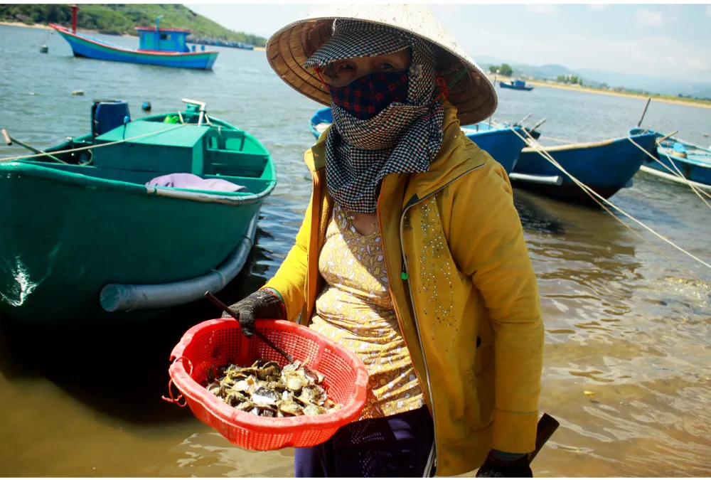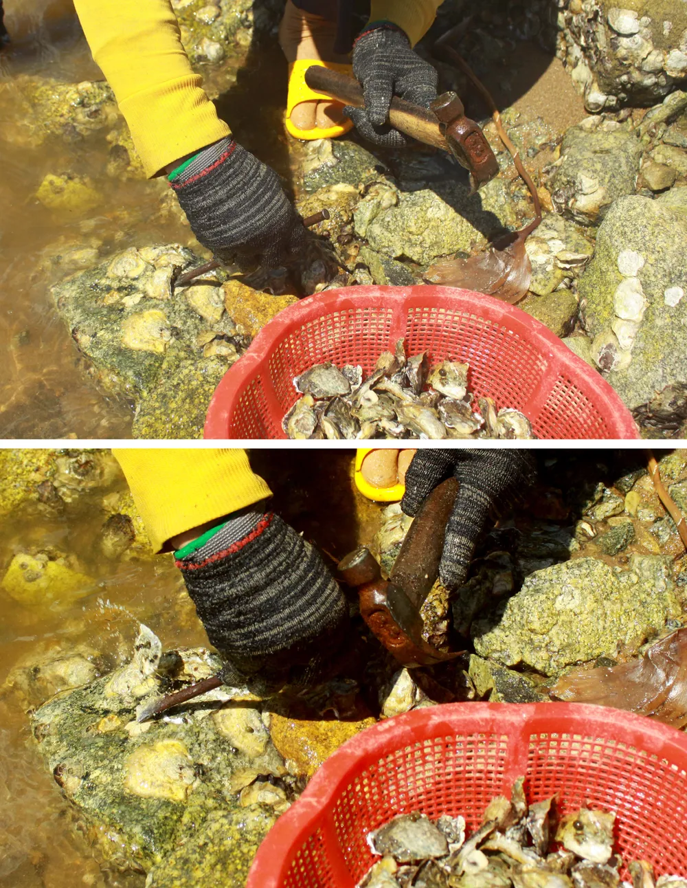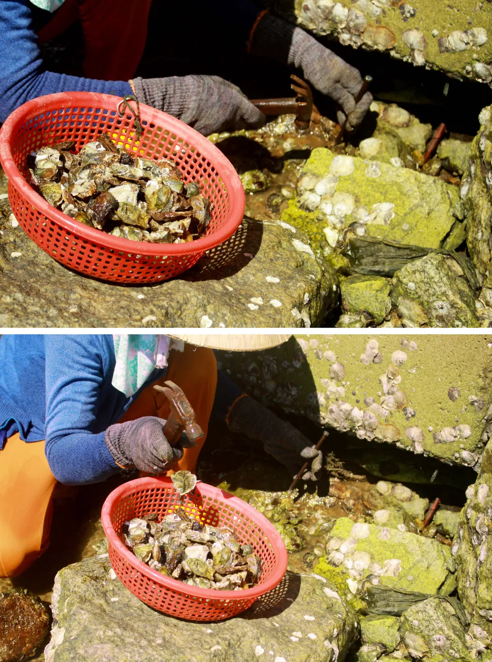 Khi thủy triều bắt đầu rút cũng là lúc người dân địa phương lại mang theo búa, đinh sắt, rổ đi dọc theo bãi đá ở cửa biển Mỹ Á (xã Phổ Quang, thị xã Đức Phổ, tỉnh Quảng Ngãi) để khai thác hàu - một loài hải sản bổ dưỡng, được nhiều người ưa thích.