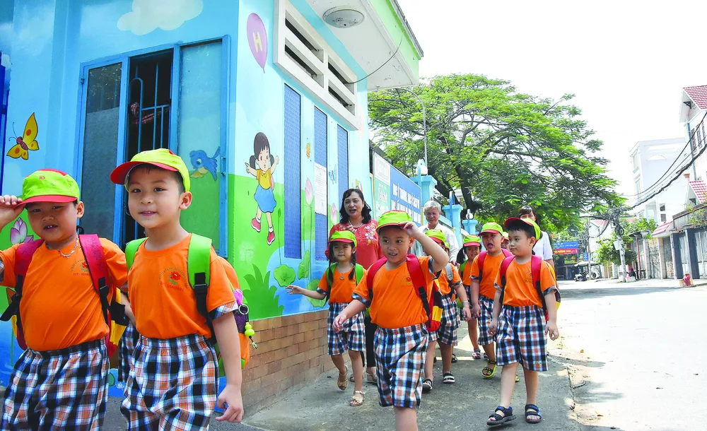 Nhờ người dân hiến đất mở rộng đường, xây dựng hệ thống thoát nước, nên giờ đây các bé không phải bì bõm lội nước vào Trường Mầm non Hương Sen (khu phố 8, phường 9, quận Gò Vấp) . Ảnh: QUANG HUY