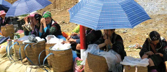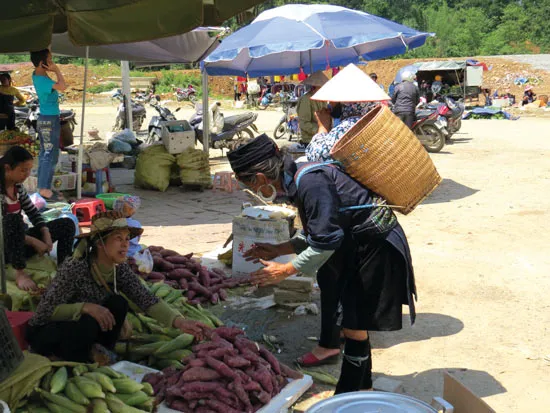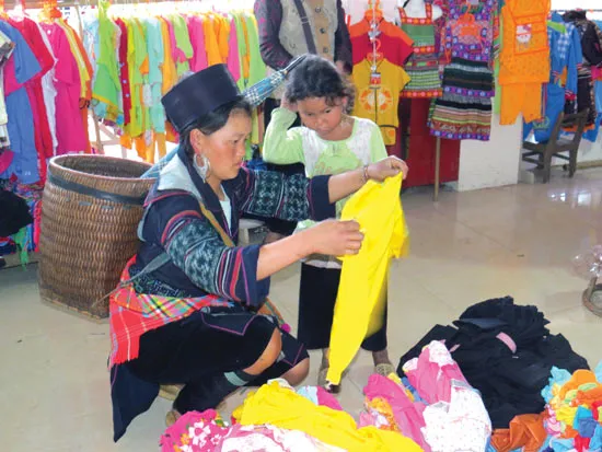 2. Trong lều chợ chính, một phụ nữ người Dao trạc 30 tuổi đang lựa mua chiếc áo cho đứa con gái chừng lên mười. Mấy chiếc áo ướm thử, đứa con gái lắc đầu, cuối cùng em cũng đồng ý chiếc áo màu vàng nhạt. Sau một hồi làm quen, chị kể con bé đòi mua áo tuần trước nhưng bận vào mùa đổ nước, ấy là khi mưa rào nước tràn qua các ruộng bậc thang thì phải lo be bờ giữ nước, nên chưa rảnh đi mua áo. Phiên chợ này, gà gáy lần hai chị lui cui nấu cơm lam đem bán, sợ không đủ tiền chị “đùm túm” thêm ít măng rừng bỏ trong chiếc gùi mang đến chợ. Gặp hên, chị bán cơm lam, măng rừng hết sớm lấy tiền mua áo cho con.