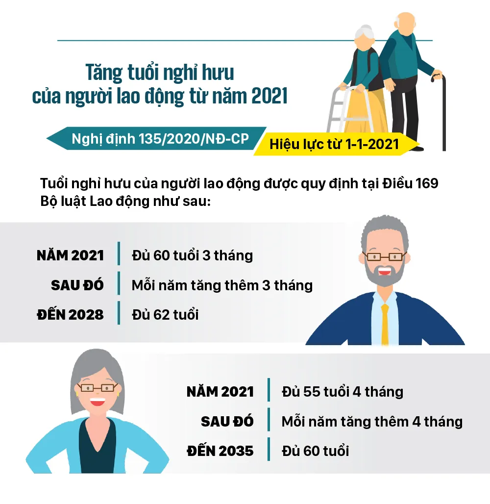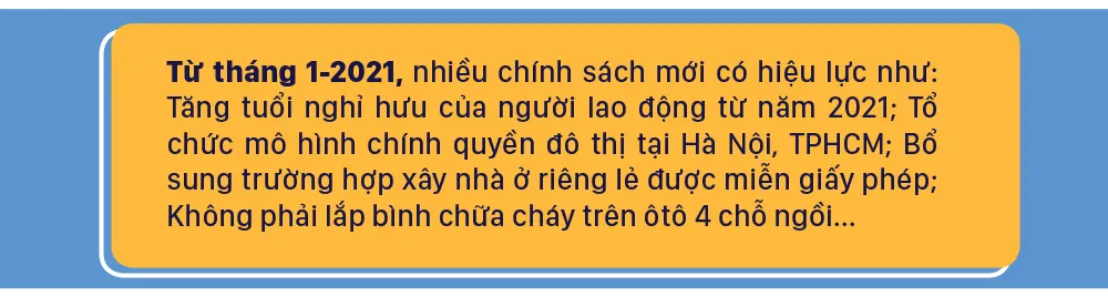 Từ tháng 1-2021, nhiều chính sách mới có hiệu lực như: Tăng tuổi nghỉ hưu của người lao động từ năm 2021; Tổ chức mô hình chính quyền đô thị tại Hà Nội, TPHCM; Bổ sung trường hợp xây nhà ở riêng lẻ được miễn giấy phép; Không phải lắp bình chữa cháy trên ô tô 4 chỗ ngồi...