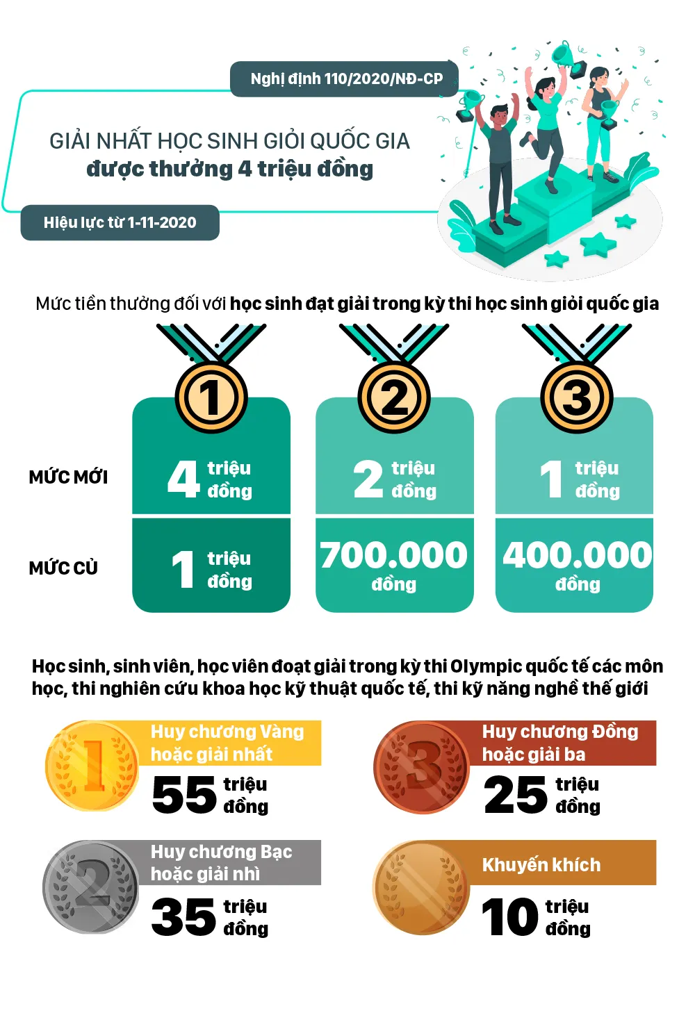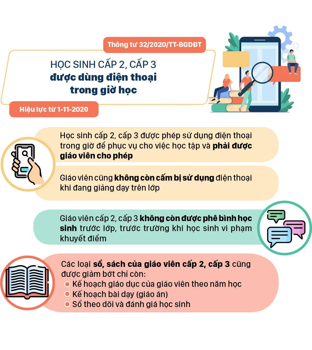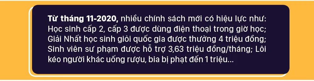 Từ tháng 11-2020, nhiều chính sách mới có hiệu lực như: Học sinh cấp 2, cấp 3 được dùng điện thoại trong giờ học; Giải Nhất học sinh giỏi quốc gia được thưởng 4 triệu đồng; Sinh viên sư phạm được hỗ trợ 3,63 triệu đồng/tháng; Lôi kéo người khác uống rượu, bia bị phạt đến 1 triệu...
