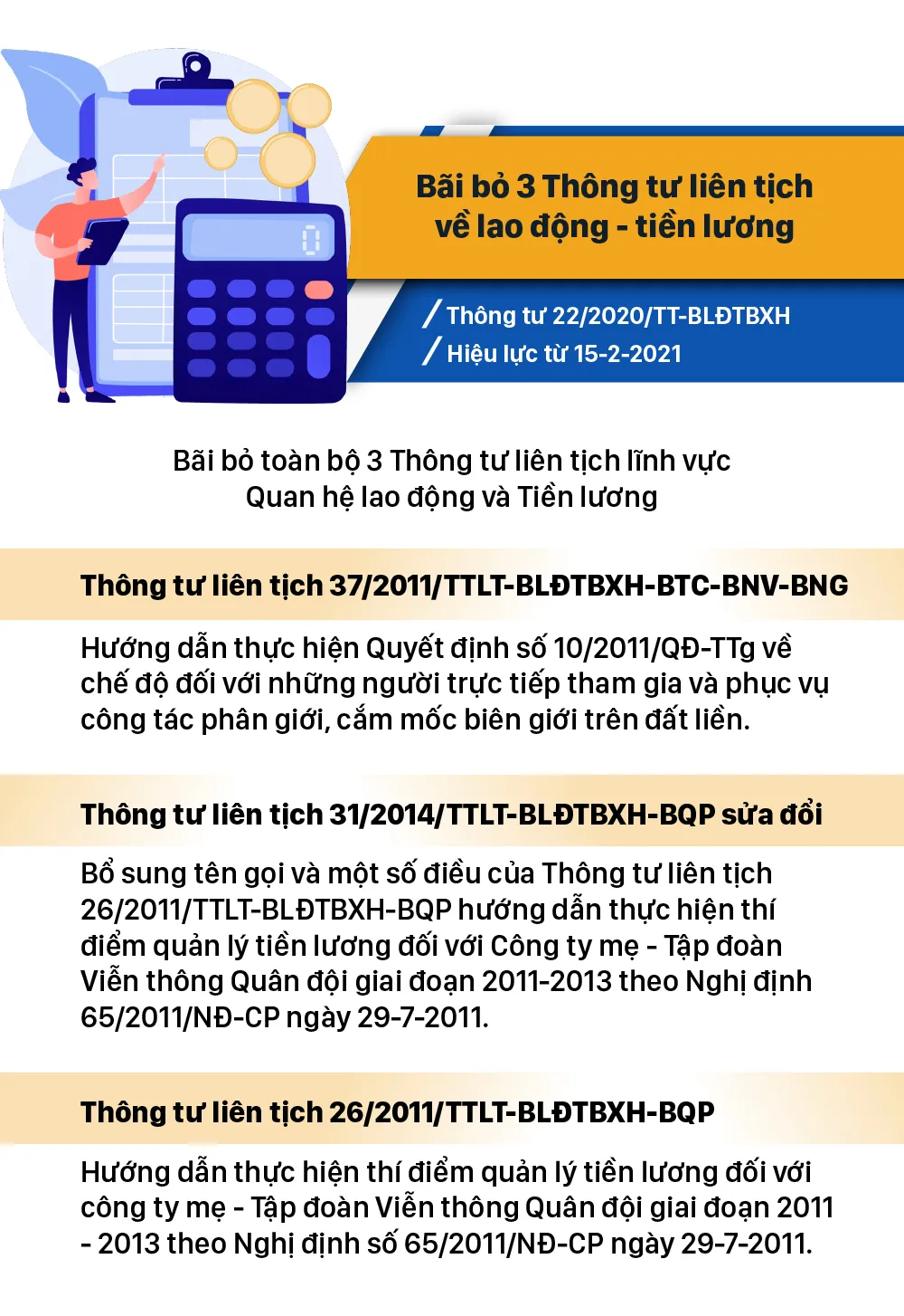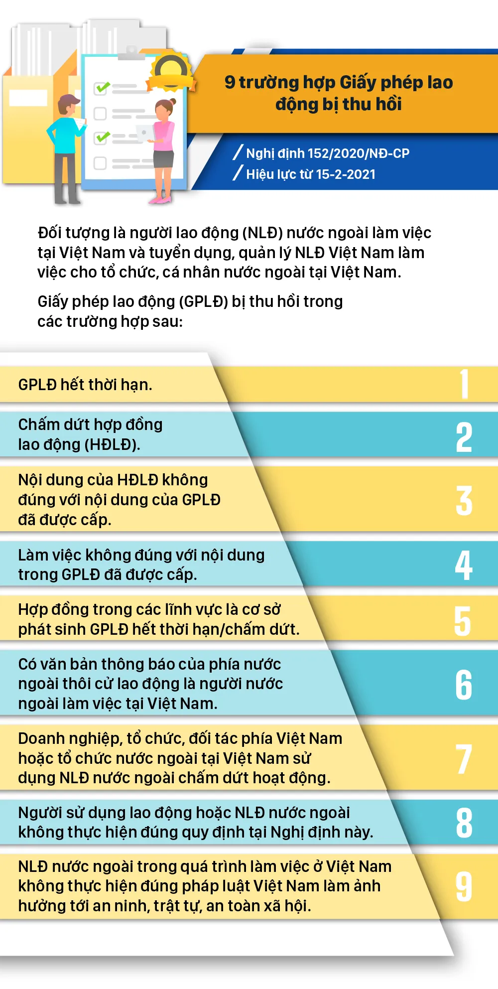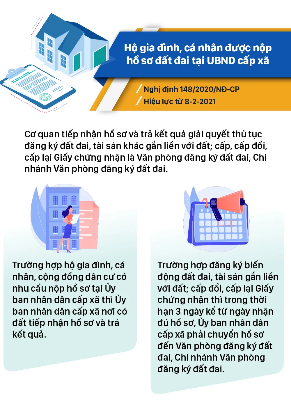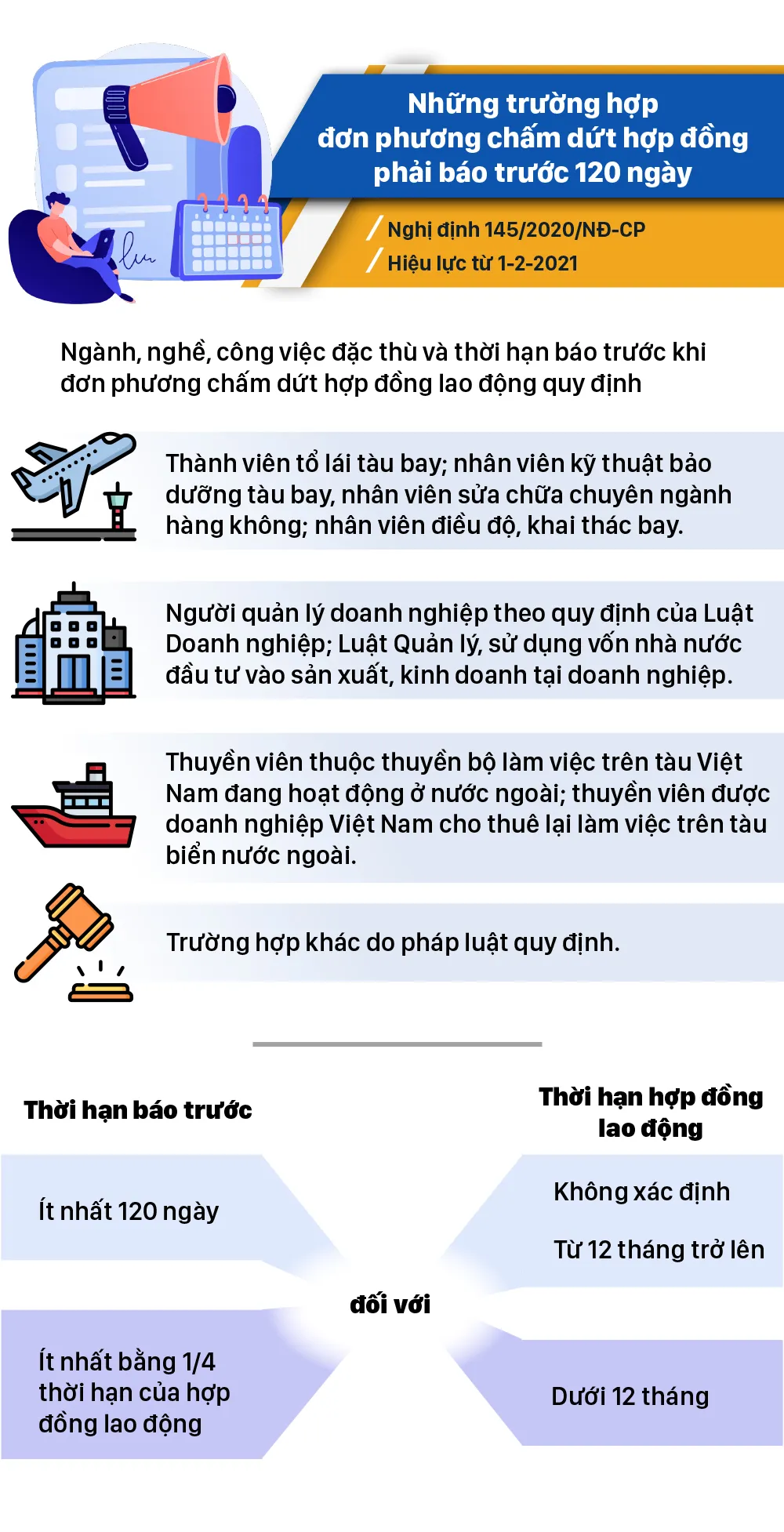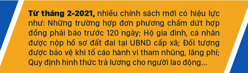 Từ tháng 2-2021, nhiều chính sách mới có hiệu lực như: Những trường hợp đơn phương chấm dứt hợp đồng phải báo trước 120 ngày; Hộ gia đình, cá nhân được nộp hồ sơ đất đai tại UBND cấp xã; Đối tượng được bảo vệ khi tố cáo hành vi tham nhũng, lãng phí; Quy định hình thức trả lương cho người lao động...