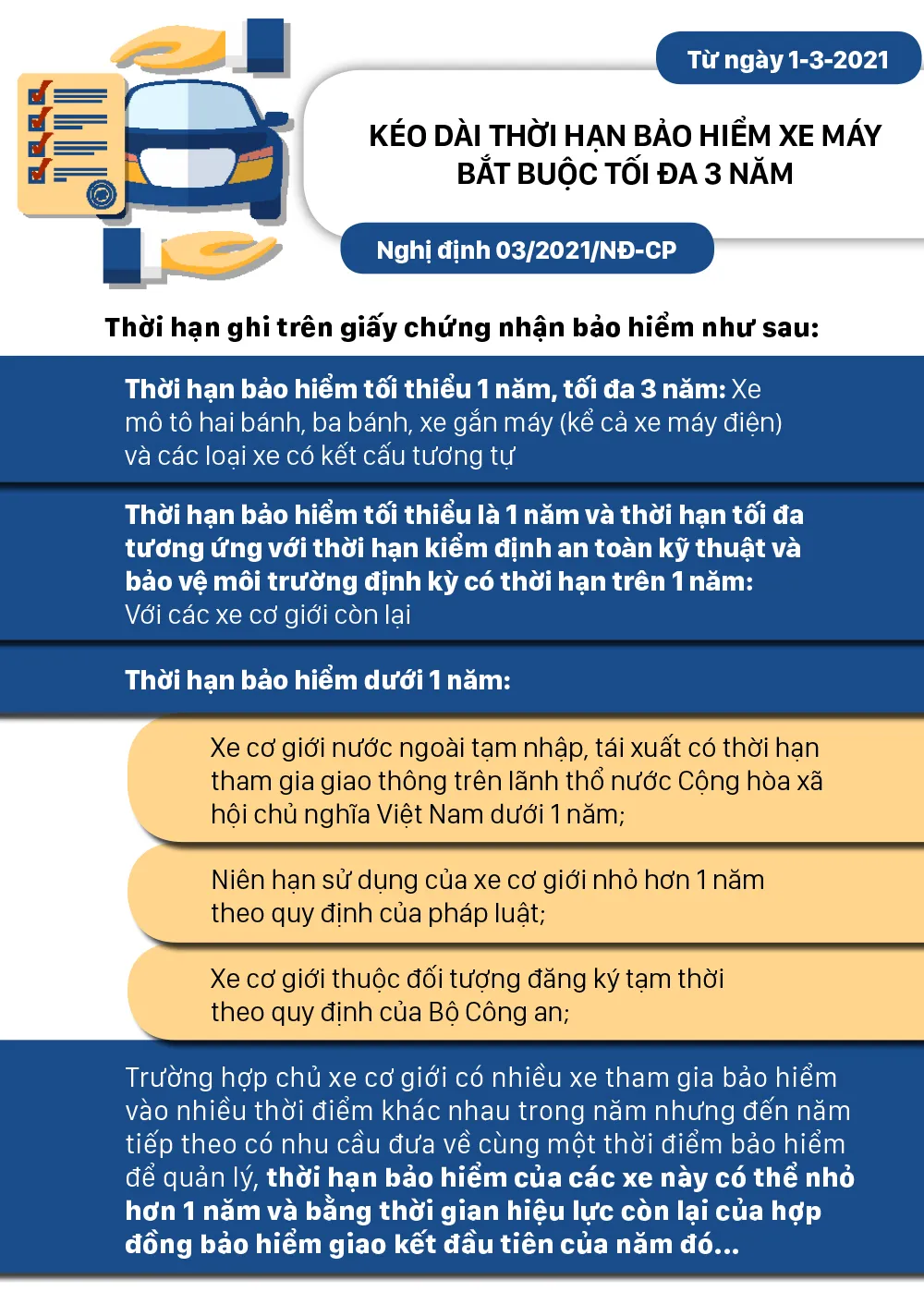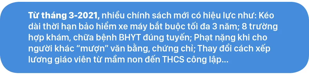 Từ tháng 3-2021, nhiều chính sách mới có hiệu lực như: Kéo dài thời hạn bảo hiểm xe máy bắt buộc tối đa 3 năm; 8 trường hợp khám, chữa bệnh BHYT đúng tuyến; Phạt nặng khi cho người khác “mượn” văn bằng, chứng chỉ; Thay đổi cách xếp lương giáo viên từ mầm non đến THCS công lập...