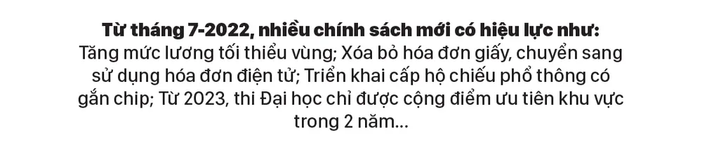 Từ tháng 7-2022, nhiều chính sách mới có hiệu lực như: Tăng mức lương tối thiểu vùng; Xóa bỏ hóa đơn giấy, chuyển sang sử dụng hóa đơn điện tử; Triển khai cấp hộ chiếu phổ thông có gắn chip; Từ 2023, thi Đại học chỉ được cộng điểm ưu tiên khu vực trong 2 năm...