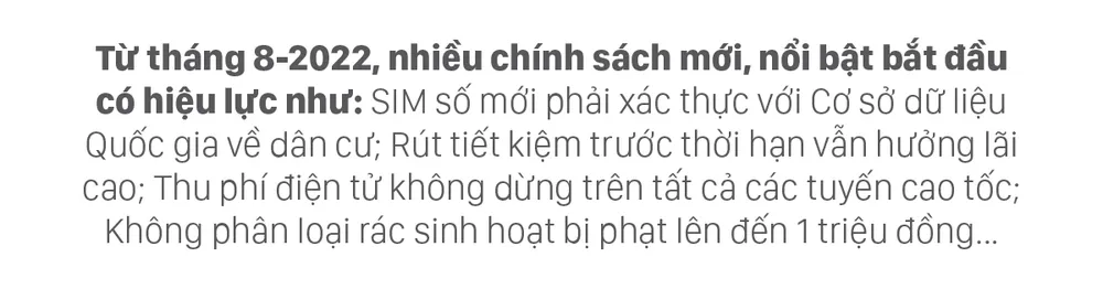 Từ tháng 8-2022, nhiều chính sách mới, nổi bật bắt đầu có hiệu lực, như: SIM số mới phải xác thực với Cơ sở dữ liệu Quốc gia về dân cư; Rút tiết kiệm trước thời hạn vẫn hưởng lãi cao; Thu phí điện tử không dừng trên tất cả các tuyến cao tốc; Không phân loại rác sinh hoạt bị phạt lên đến 1 triệu đồng