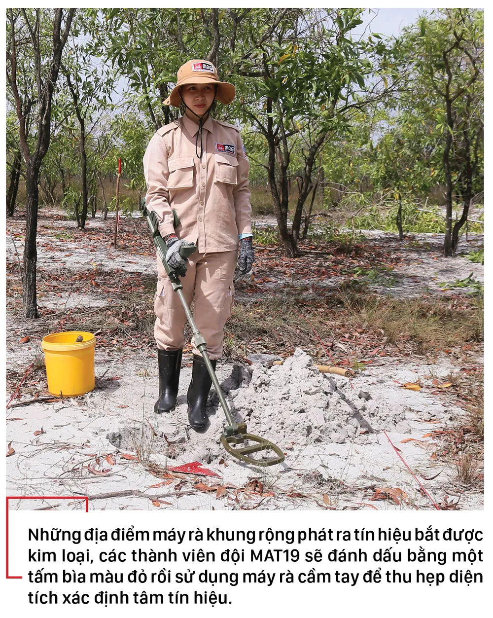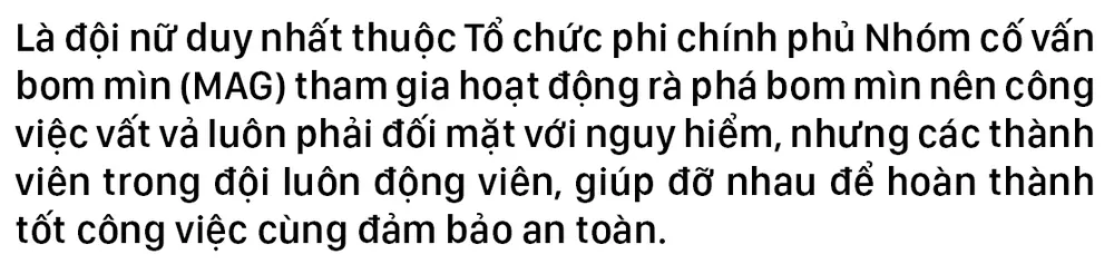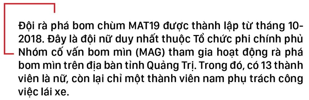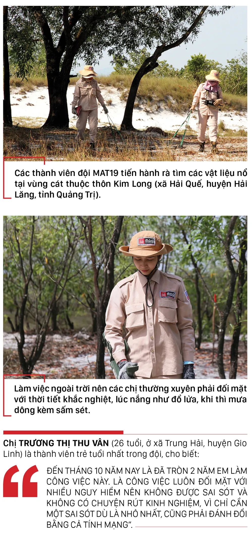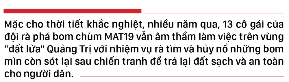 Mặc cho thời tiết khắc nghiệt, nhiều năm qua, 13 cô gái của đội rà phá bom chùm MAT19 vẫn âm thầm làm việc trên vùng "đất lửa" Quảng Trị với nhiệm vụ rà tìm và hủy nổ những bom mìn còn sót lại sau chiến tranh để trả lại đất sạch và an toàn cho người dân.
