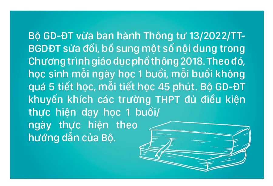 Bộ GD-ĐT vừa ban hành Thông tư 13/2022/TT-BGDĐT sửa đổi, bổ sung một số nội dung trong Chương trình giáo dục phổ thông 2018. Theo đó, học sinh mỗi ngày học 1 buổi, mỗi buổi không quá 5 tiết học, mỗi tiết học 45 phút. Bộ GD-ĐT khuyến khích các trường THPT đủ điều kiện thực hiện dạy học 1 buổi/ngày thực hiện theo hướng dẫn của Bộ.