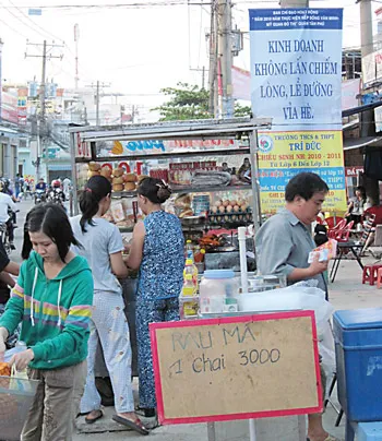 >> Ảnh chụp trên đường Lũy Bán Bích, phường Hòa Thạnh, quận Tân Phú - con đường đang được mở rộng để trở thành tuyến đường trọng điểm của quận. Dọc lề đường có treo các băng rôn kêu gọi người dân giữ gìn vệ sinh môi trường, tuy nhiên vẫn còn nhiều người dùng vỉa hè làm nơi buôn bán. Ảnh: TẤN THÀNH