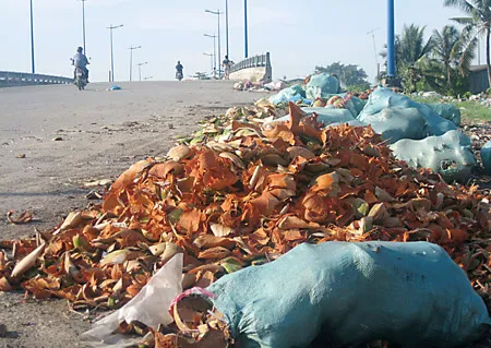 >> Khu vực chân cầu vượt Gò Dưa nằm trên quốc lộ 1A (phường Tam Bình, quận Thủ Đức) gần đây rác thải tập trung thành từng đống lớn và lan ra cả mặt đường. Ảnh: ĐỨC PHÚ