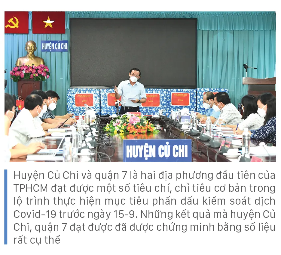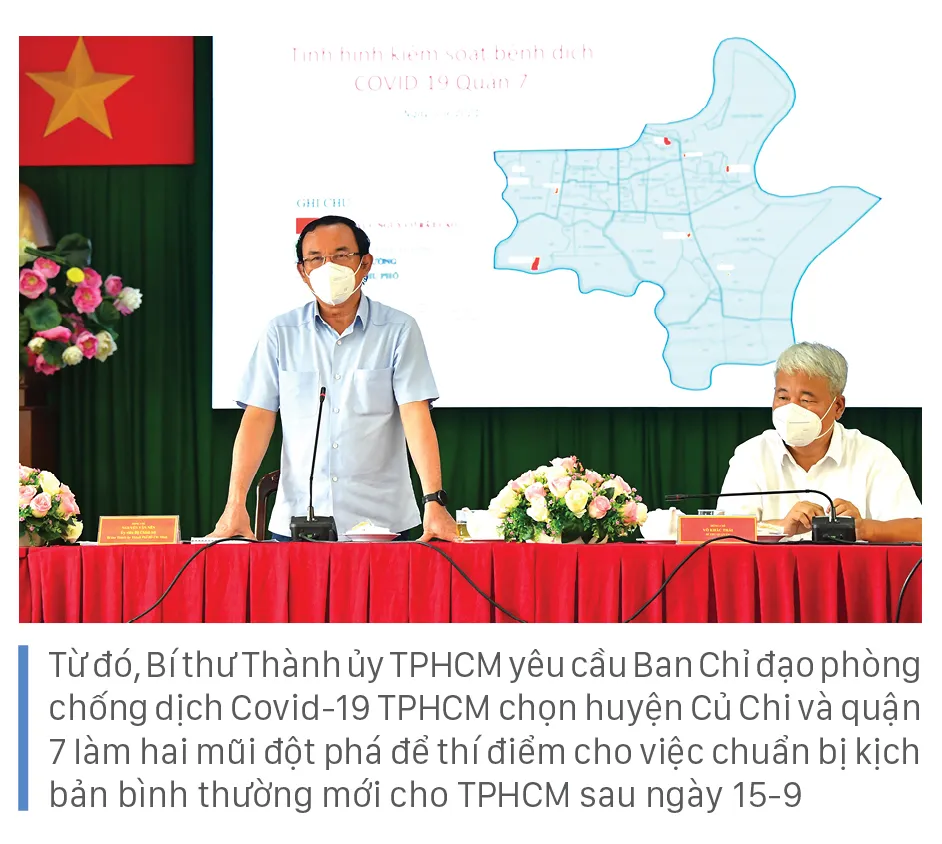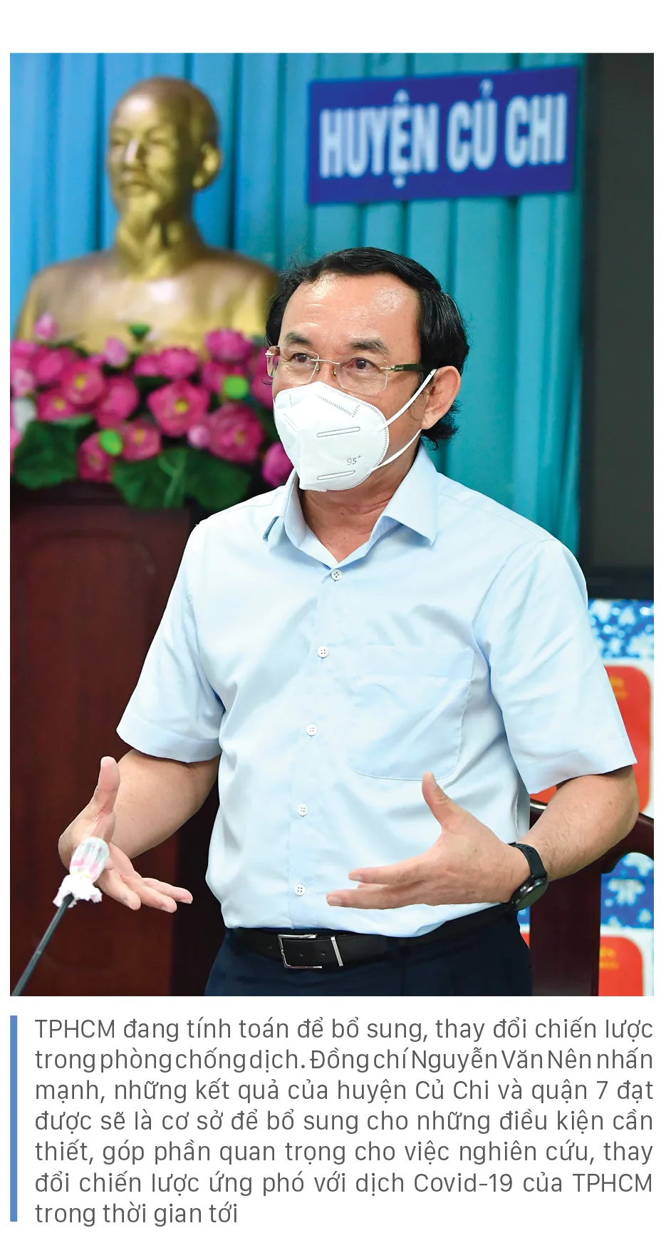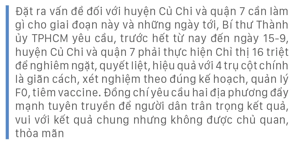 TPHCM đang cố gắng phấn đấu kiểm soát được dịch bệnh trên địa bàn trước ngày 15-9 như Nghị quyết 86 của Chính phủ. Huyện Củ Chi và quận 7 là hai địa phương đầu tiên của TP đã cơ bản kiểm soát được dịch Covid-19. Đánh giá cao nỗ lực của hai địa phương, đồng chí Nguyễn Văn Nên yêu cầu Ban Chỉ đạo phòng chống dịch Covid-19 TPHCM chọn huyện Củ Chi và quận 7 làm hai mũi đột phá để thí điểm cho việc chuẩn bị kịch bản bình thường mới cho TPHCM sau ngày 15-9.