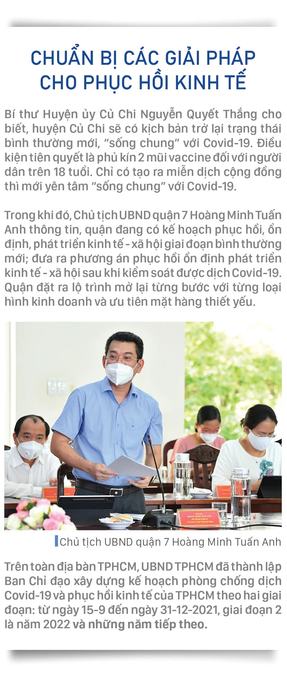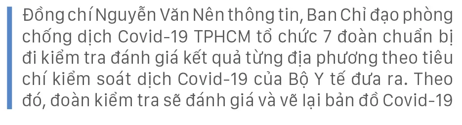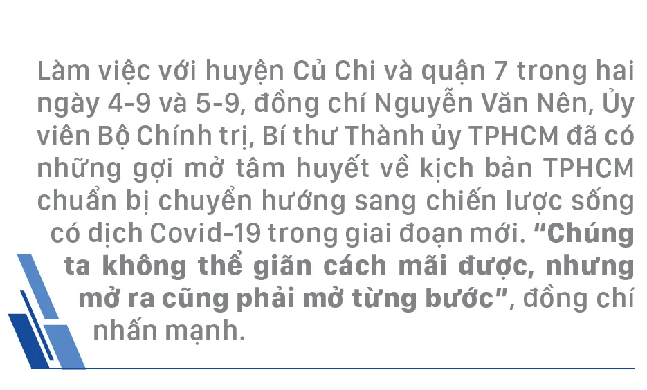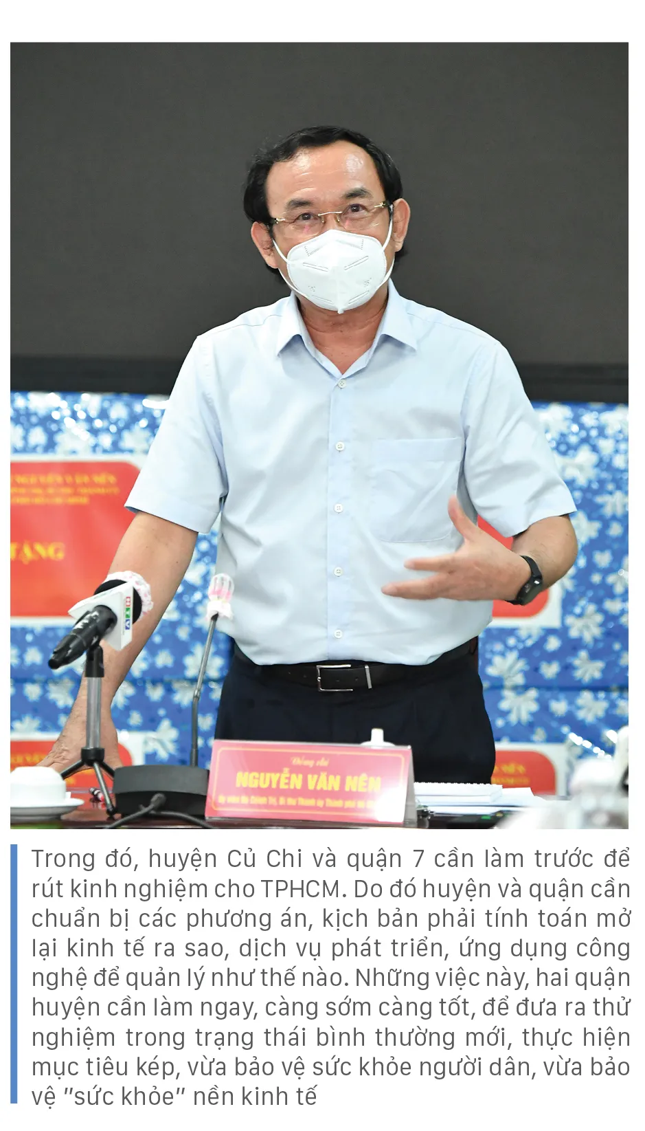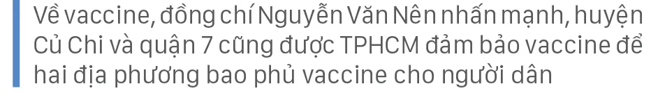 TPHCM đang cố gắng phấn đấu kiểm soát được dịch bệnh trên địa bàn trước ngày 15-9 như Nghị quyết 86 của Chính phủ. Huyện Củ Chi và quận 7 là hai địa phương đầu tiên của TP đã cơ bản kiểm soát được dịch Covid-19. Đánh giá cao nỗ lực của hai địa phương, đồng chí Nguyễn Văn Nên yêu cầu Ban Chỉ đạo phòng chống dịch Covid-19 TPHCM chọn huyện Củ Chi và quận 7 làm hai mũi đột phá để thí điểm cho việc chuẩn bị kịch bản bình thường mới cho TPHCM sau ngày 15-9.