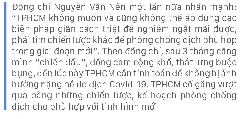 Đặc biệt, hai buổi làm việc đã mang đến nhiều thông điệp ý nghĩa. Tại hai nơi làm việc, Bí thư Thành ủy TPHCM đã có những gợi mở tâm huyết về kịch bản TPHCM chuẩn bị chuyển hướng sang chiến lược sống có dịch Covid-19 trong giai đoạn mới. “Chúng ta không thể giãn cách mãi được, nhưng mở ra cũng phải mở từng bước”, đồng chí nhấn mạnh.