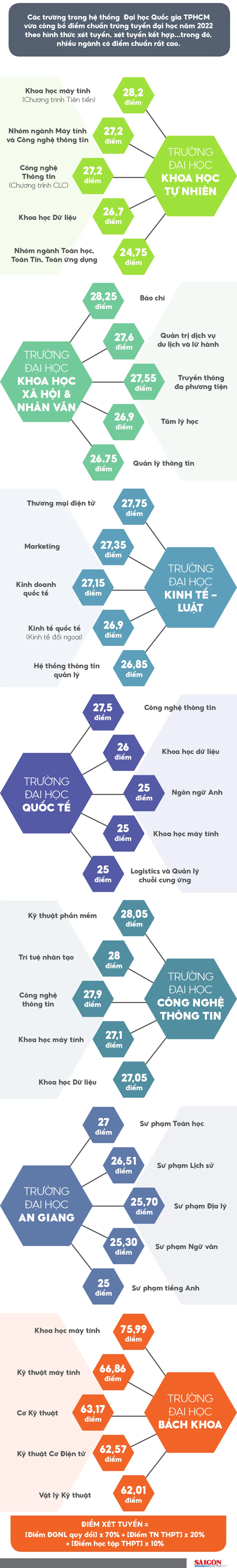 Các trường trong hệ thống Đại học Quốc gia TPHCM vừa công bố điểm chuẩn trúng tuyển đại học năm 2022 theo hình thức xét tuyển, xét tuyển kết hợp...trong đó, nhiều ngành có điểm chuẩn rất cao.