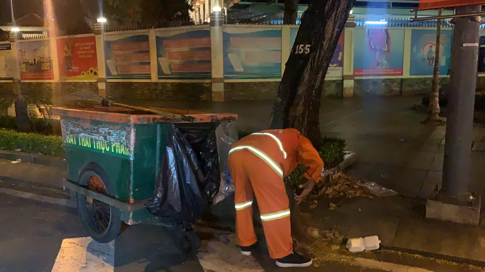 Nhiều công nhân quét rác miệt mài dọn dẹp trong đêm 29 và rạng sáng mùng 1 Tết Nguyên đán. Ảnh: CHÍ THẠCH