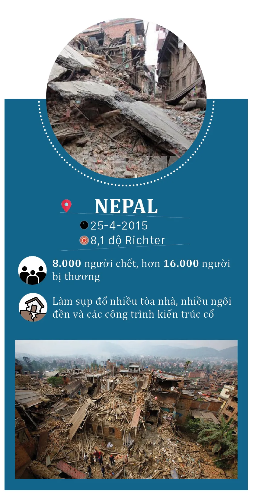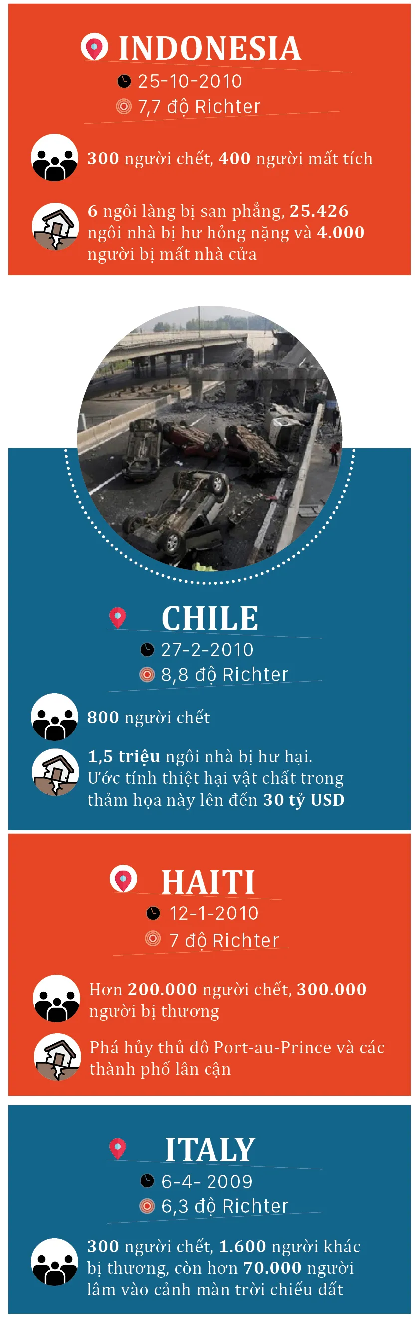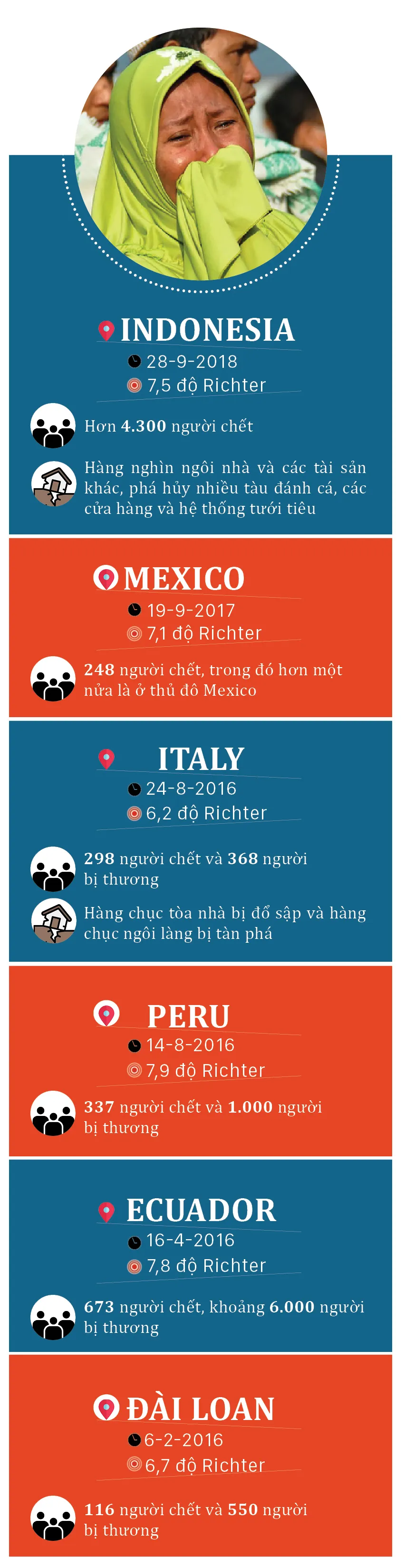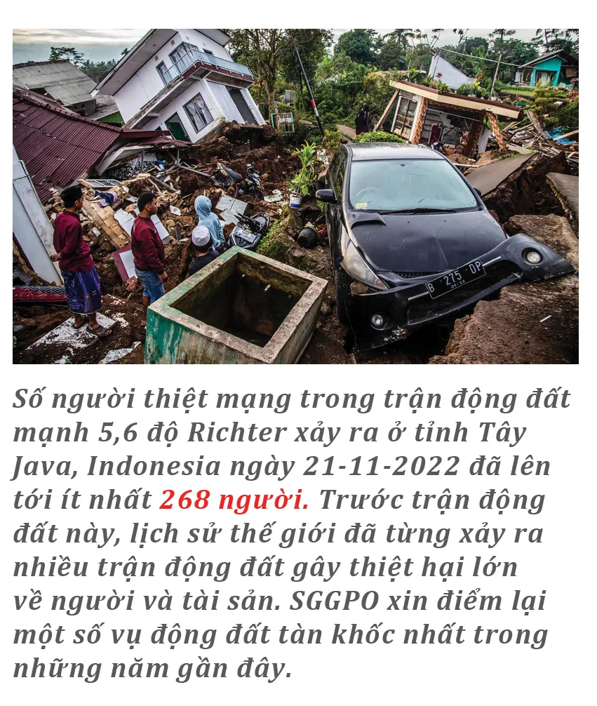 Số người thiệt mạng trong trận động đất mạnh 5,6 độ Richter xảy ra ở tỉnh Tây Java, Indonesia ngày 21-11-2022 đã lên tới ít nhất 268 người. Trước trận động đất này, lịch sử thế giới đã từng xảy ra nhiều trận động đất gây thiệt hại lớn về người và tài sản. SGGPO xin điểm lại một số vụ động đất tàn khốc nhất trong những năm gần đây.