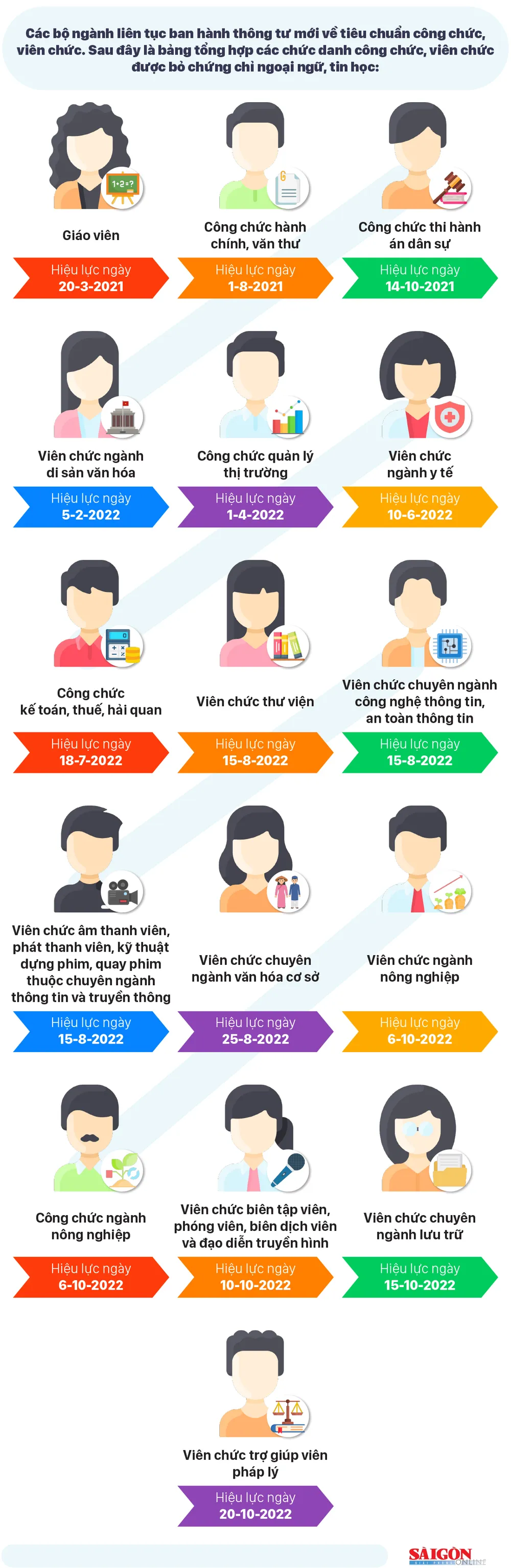 Các bộ ngành liên tục ban hành Thông tư mới về tiêu chuẩn công chức, viên chức. Sau đây là bảng tổng hợp các chức danh công chức, viên chức được bỏ chứng chỉ ngoại ngữ, tin học: