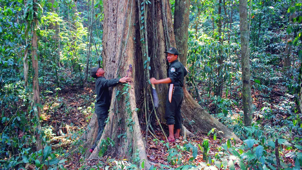 Trên chiếc xe máy độ chế, chúng tôi băng cắt qua những cánh rừng già ở làng Vir. Di chuyển qua làng Vir tầm 3km, những cây gỗ giáng hương lần lượt hiện ra. Tại khu vực bên mép núi, một nhân viên bảo vệ rừng lấy tay gõ vào thân cây gỗ khổng lồ rồi khoe, đây là cây gỗ giáng hương với tuổi đời hơn trăm năm. Cây gỗ này có đường kính gốc hơn 1m, thân dài khoảng 35m, mọc thẳng tắp, lá đã rụng hết. “Lá rụng không phải cây chết đâu, mà do đến mùa này thì giáng hương rụng lá”, người đi cùng giải thích.