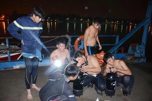 Lực lượng cứu nạn cứu hộ kiểm tra lại thiết bị để chuẩn bị lặn tìm nạn nhân mất tích.