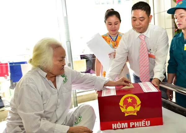 Bệnh nhân Vũ Thị Nga (1938) đang điều trị tại Khoa cơ xương khớp, Bệnh viện Bạch Mai, Hà Nội được tổ bầu cử mang hòm phiếu đến tận giường bệnh . Ảnh: Lã Anh